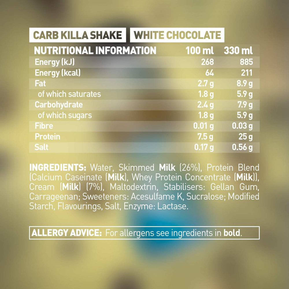 If you love white chocolate and you love protein, this protein shake will be 'white' up your street! This smooth creamy, lactose-free Protein Shake is a tasty way to max your protein intake whilst on the move. Not only is it packed with 25g of protein, but it also is low in sugar and is suitable for vegetarians. Just like the rest of our bottled protein shake range. If time is on your side, why not enjoy as a replacement of milk in your breakfast cereal? A portion of milk contains just 8g of protein, therefore increasing your protein intake by over 3 times with our White Chocolate Protein Shake.