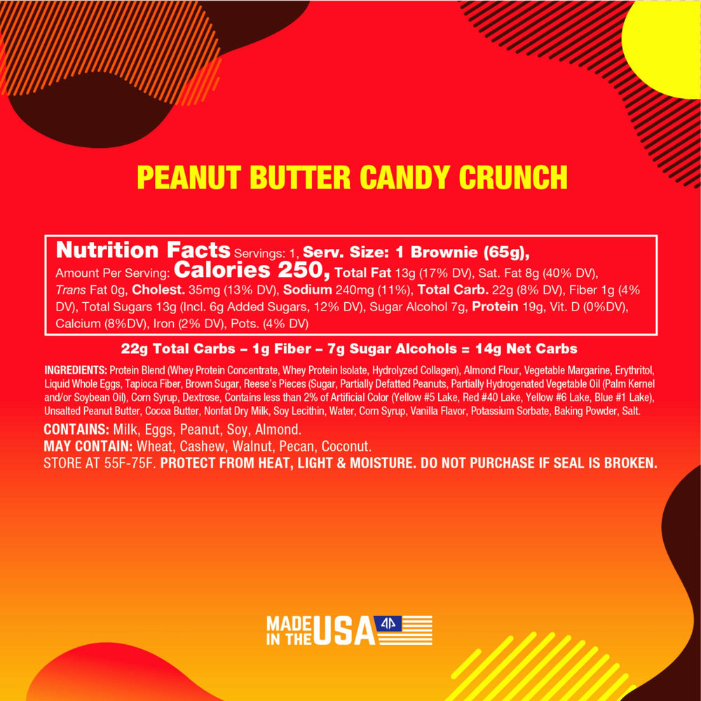 Your favorite candy just got a high protein upgrade. Our Peanut Butter Candy Crunch Prime Bites® have a moist blondie base, indulgent glaze, and are complete with real peanut butter candy pieces. Each brownie is a fusion of taste and nutrition, offering a heavenly treat that packs in essential proteins without the unnecessary sugar. Remember those moments on the go, when you're wishing for a fairy godmother to grant you a tasty, nutritious snack? Well, consider Prime Bites® Protein Brownies your wish come true! These delectable goodies are not just designed for the movers and shakers of the world but for anyone craving a scrumptious pick-me-up without compromising on health. Unlike the other low-sugar impersonators, our brownies stay true to their mission. They're the real deal, striking the perfect balance between health and taste. Each bite guarantees a mouthful of soft, chewy, brownie bliss that’ll have your taste buds doing the happy dance. Let's face it; life is too short for bland snacks, so let's enjoy the little indulgence moments that keep us fit and fab! This product is only intended for consumption by healthy adults aged 18 years or older. Do not use if pregnant, nursing, or currently taking PDE5 inhibitors or nitrates for chest pain. Consult a licensed, qualified, healthcare professional before taking this product, especially if you are on any other dietary supplement, prescription drug, or over-the-counter medication; or if you suspect you have or have been treated for, diagnosed with, or have a family history of, any medical condition. Discontinue use 2 weeks before surgery. Immediately discontinue use and contact a medical doctor if you experience any adverse reaction to this product. Use only as directed. Do not use if the safety seal is broken or missing. Store in a cool, dry place. KEEP OUT OF REACH OF CHILDREN.