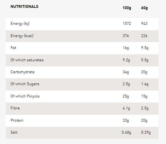 Milk Chocolate with Sweetener (25%)(Sweetener: Maltitol; Cocoa Butter, Whole Milk Powder, Cocoa Mass, Emulsifier: Soy Lecithin; Natural Flavouring), Protein Blend (Calcium Caseinate (Milk), Whey Protein Isolate(Milk)), Humectant: Glycerol; Hydrolysed Beef Gelatine, Chocolate Chips With Sweetener (8%) (Sweetener: Maltitol; Cocoa Mass, Emulsifier: Soy Lecithin, Low Fat Cocoa Powder, Natural Vanilla Flavouring), Bulking Agent: Polydextrose; Palm Fat, White Chocolate with Sweetener (Sweetener: Maltitol; Cocoa Butter, Whole Milk Powder, Emulsifier: Soy Lecithin; Natural Flavouring), Low Fat Cocoa Powder, Sea Salt, Flavouring, Sweetener: Sucralose.