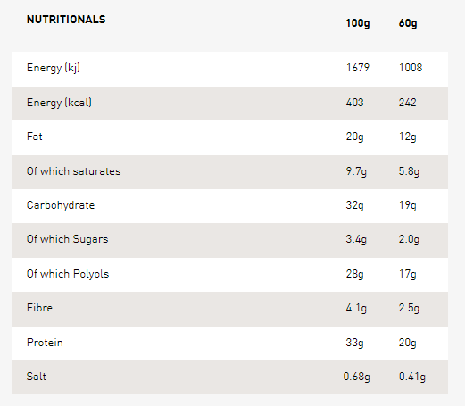 White Chocolate with Sweetener (32%) (Sweetener: Maltitol; Cocoa Butter, Whole Milk Powder, Emulsifier: Soy Lecithin; Natural Flavouring), Protein Blend (Calcium Caseinate (Milk), Whey Protein Isolate (Milk)), Humectant: Glycerol; Hydrolysed Beef Gelatine, Isomalto-Oligosaccharide, Roasted Peanuts (7%), Water, Palm Fat, Peanut Paste (2,6%) (Peanut Kernels, Peanut Oil) , Flavouring, Salt, Sweetener: Sucralose.