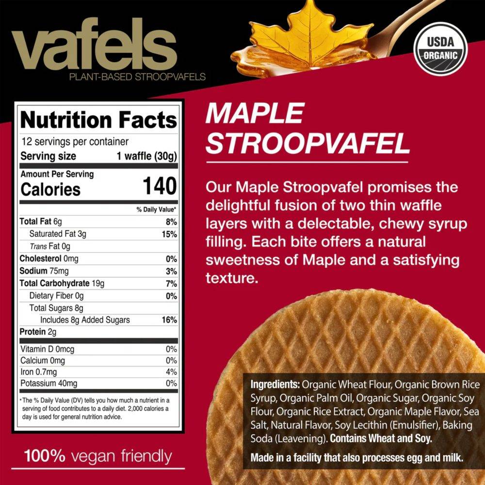 Maple Stroopvafels: Organic wheat flour, Organic brown rice syrup, Organic palm oil, Organic sugar, Organic soy flour, Organic rice extract, Organic maple flavor, Sea salt, Natural flavor, Soy lecithin (emulsifier), Baking soda (leavening)