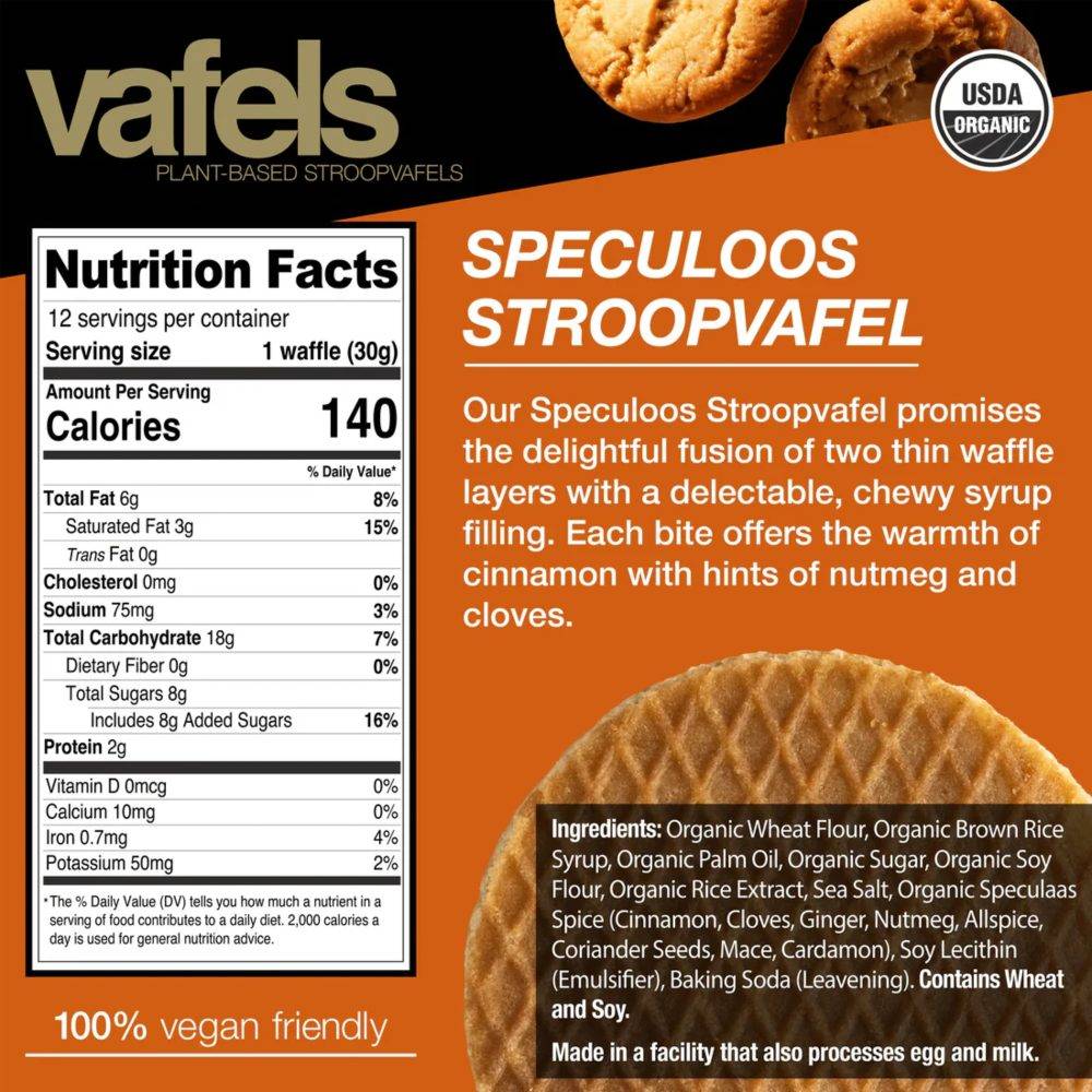 Speculoos Stroopvafels: Organic wheat flour, Organic brown rice syrup, Organic palm oil, Organic sugar, Organic soy flour, Organic rice extract, Sea salt, Organic Speculaas spice (cinnamon, cloves, ginger, nutmeg, allspice, coriander seeds, mace, cardamon), Soy lecithin (emulsifier), Baking soda (leavening).