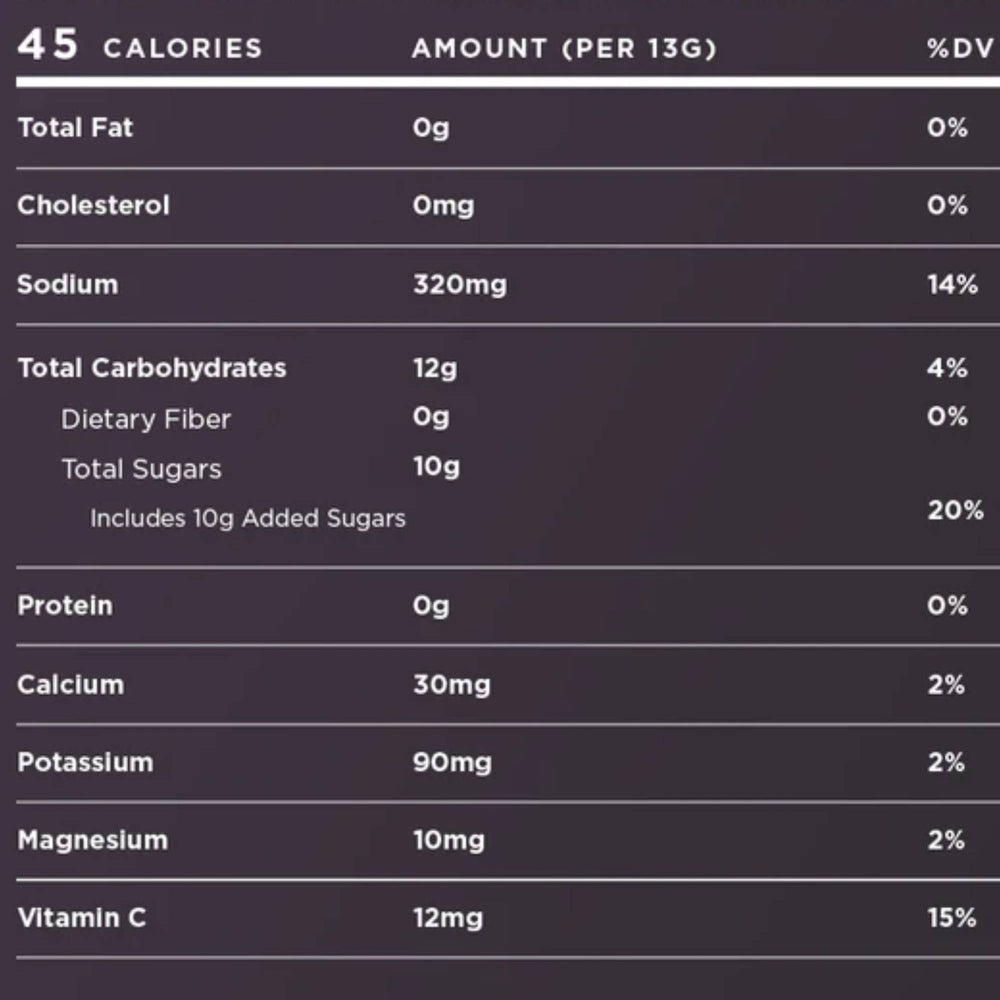 Cane Sugar, Natural Flavors, Sea Salt, Citric Acid, Sodium Citrate, Potassium Salt, Vitamin C, Calcium Carbonate, Magnesium Oxide.