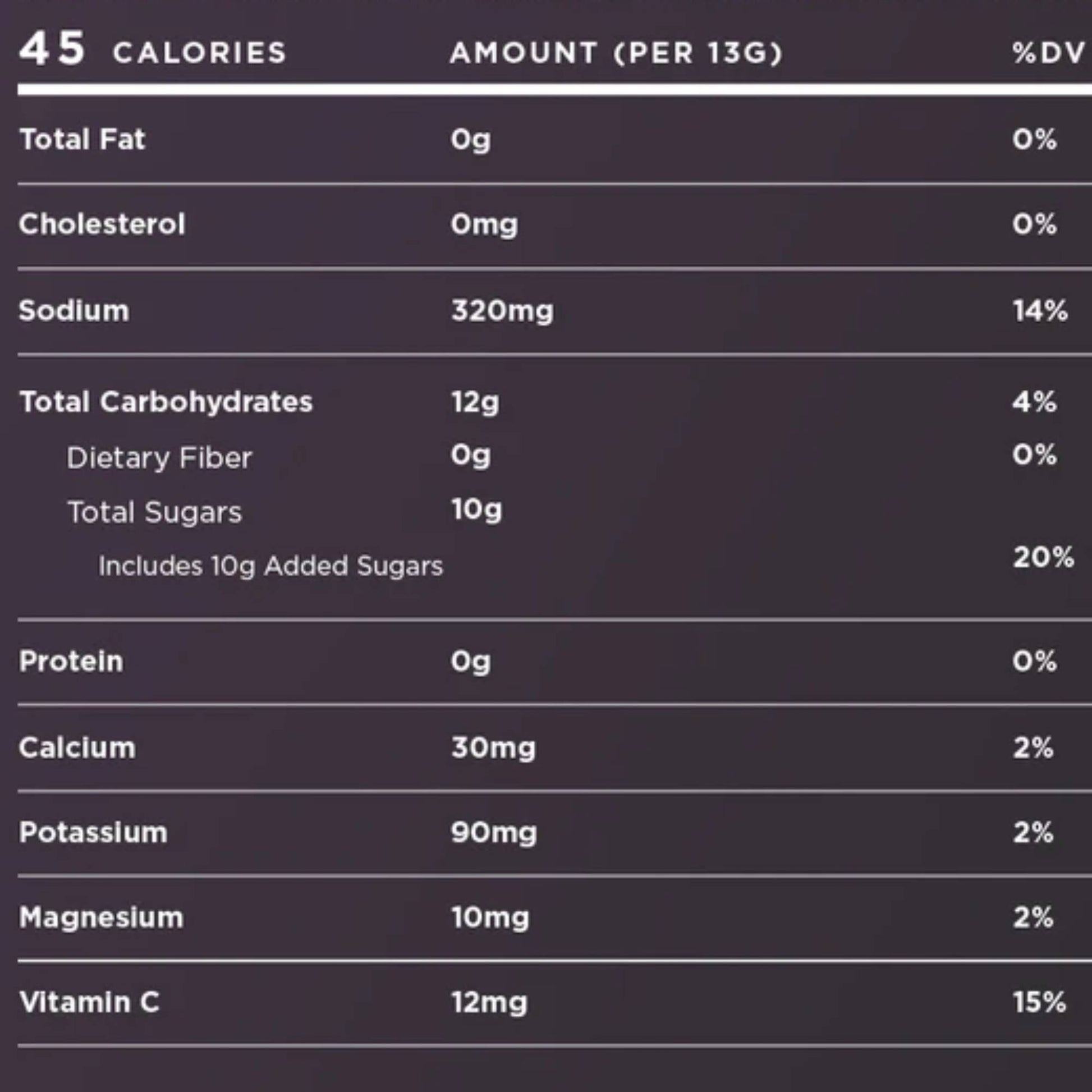Cane Sugar, Natural Flavors, Sea Salt, Citric Acid, Sodium Citrate, Potassium Salt, Vitamin C, Calcium Carbonate, Magnesium Oxide.
