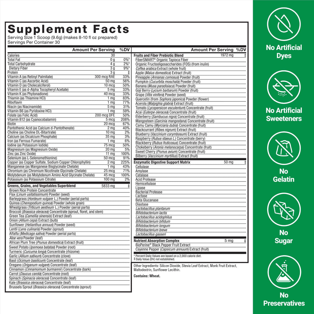 Every refreshing sip provides essential vitamins, minerals, and fiber from more than 40 fruits, vegetables, and superfoods like kale, broccoli, spinach, chia seeds, wheatgrass, exotic berries, turmeric, and more.LactoSpore®