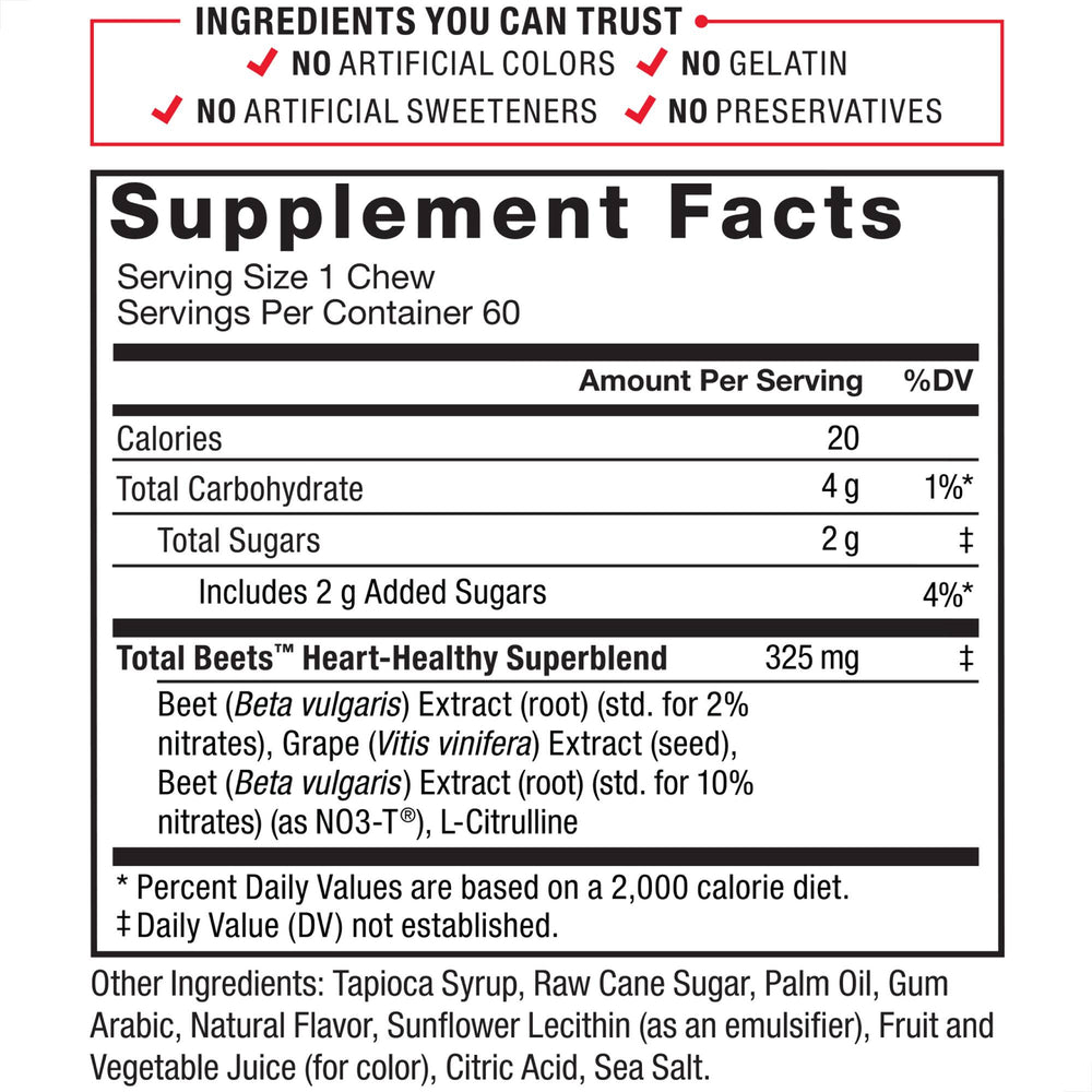 Too many energy supplements are designed without heart health in mind. Some energy boosters — stimulant-packed energy drinks, for instance — can narrow blood vessels, which forces your heart to work harder to pump blood throughout your body. That’s why the scientists at Force Factor® developed Total Beets Soft Chews as a safe source of heart-healthy energy. These delicious chews include nitrates and antioxidants, and help give you an anytime energy boost to tackle whatever life throws your way. This superfood formula features both beetroot powder and beetroot extract, blended together with antioxidant-rich grapeseed extract in a naturally flavored, tasty açaí berry chew with no bitter beet aftertaste. No matter what you are looking to accomplish, Total Beets Soft Chews help deliver a clear boost of energy specifically formulated with cardiovascular health in mind so you can fully Unleash Your Potential®.