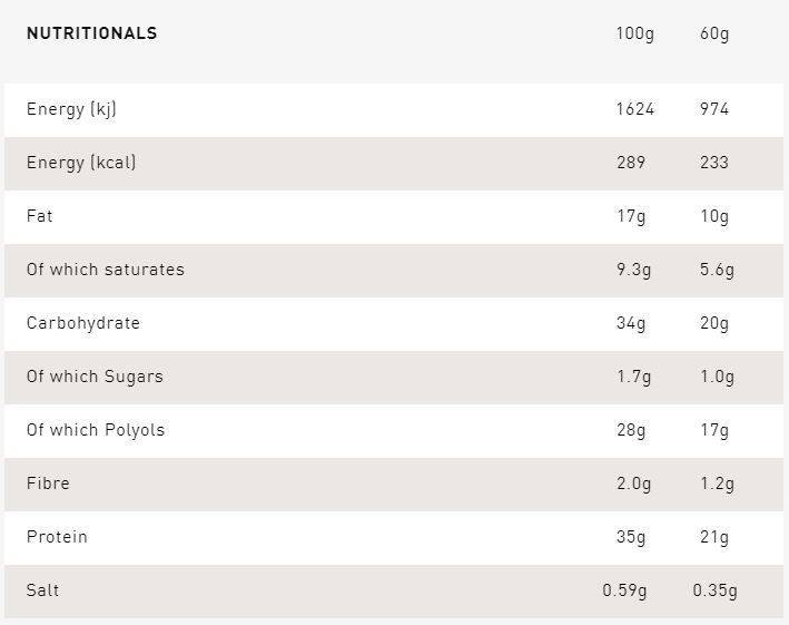 Protein Blend (Calcium Caseinate (Milk), Whey Protein Isolate(Milk)), Milk Chocolate with Sweetener (20%) (Sweetener: Maltitol; Cocoa Butter, Whole Milk Powder, Cocoa Mass, Emulsifier: Soy Lecithin; Natural Flavouring), Bovine Collagen Hydrolysate, Humectant: Glycerol; Sweeteners: Maltitol, Sucralose; Palm Oil, Water, Fat- reduced Cocoa Powder (3%), Wheat Flour, Maize Starch, Rapeseed Oil, Bulking Agent: Polydextrose; Sea Salt, Wheat Starch, Emulsifier: Soy Lecithin; Raising Agents: Ammonium Carbonates, Sodium Carbonates; Acidity Regulator: Sodium Hydroxide; Flavourings.
