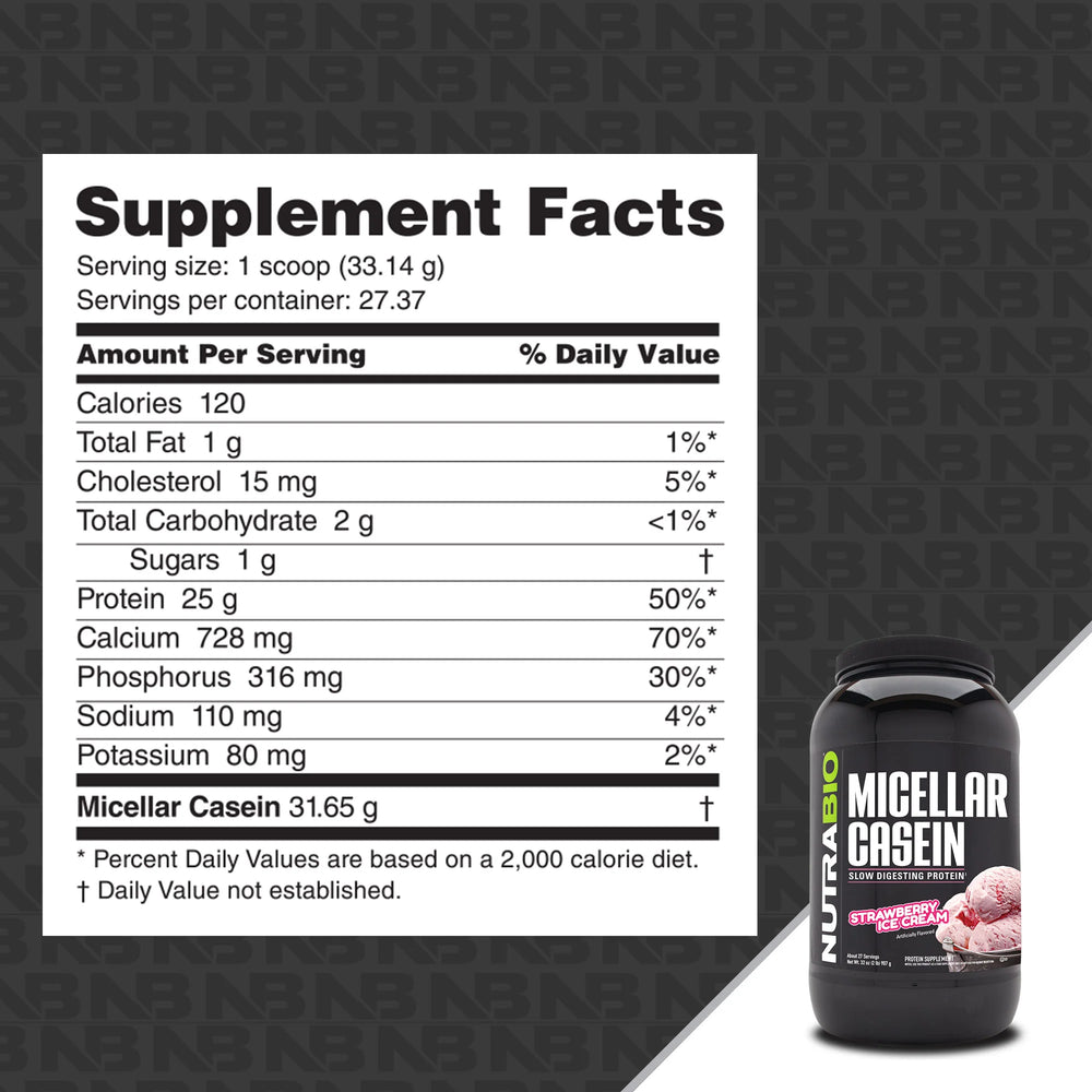 Slow digesting Micellar Casein (pronounced kay-seen) is a complete protein that supplies all of the essential amino acids in the amounts necessary for muscle growth and maintenance. One serving of NutraBio Casein provides a complete serving of muscle building BCAA's and glutamine/glutamine precursors while maintaining a low fat, low carb profile. Rapid protein release, characteristic of whey protein, is desirable immediately before and after exercise to help refuel recovering muscles. But delayed digestion and absorption may be more beneficial at other times - including bedtime when your body typically goes for hours without food. Micellar Casein protein is digested at a slower rate than its counterpart whey protein causing a slower release of amino acids into the blood stream. Sometimes slower is better. Casein proteins are PH sensitive causing them to thicken in the acidic environment of the stomach. The ability of this protein to form a gel in the gut slows down its digestion allowing for a steady release of amino acids for up to 7 full hours after ingestion. This slow release of nutrients can feed your muscles with protein and amino acids for hours! Because of their unique time-released qualities, caseins are considered anti-catabolic or muscle-protecting proteins. Casein protein is the predominant protein found in milk. It makes up about 80% of the protein in cow's milk, while the remaining 20% of protein in milk is whey. Casein protein is extracted from the milk through ultra-filtration process, without the use of chemicals. This process increases the amount of bioactive milk peptides that support immune function as well as enhance muscle growth. Casein protein has an excellent amino acid profile and is primarily known as an extremely slow-digesting protein.
