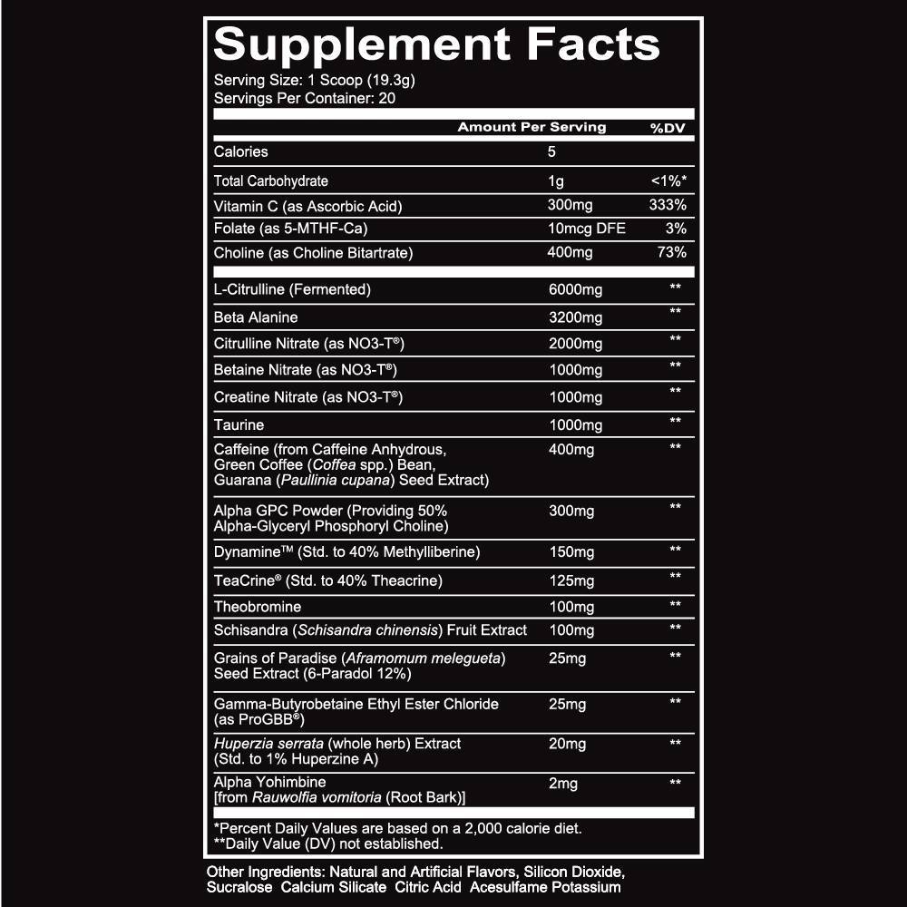 - HIGH STIMULANT WITH 400MG CAFFEINE, PLUS 150MG DYNAMINE® AND 125MG TEACRINE® TO ENHANCE EFFECTS OF CAFFEINE FOR AN EXTREME PRE WORKOUT.