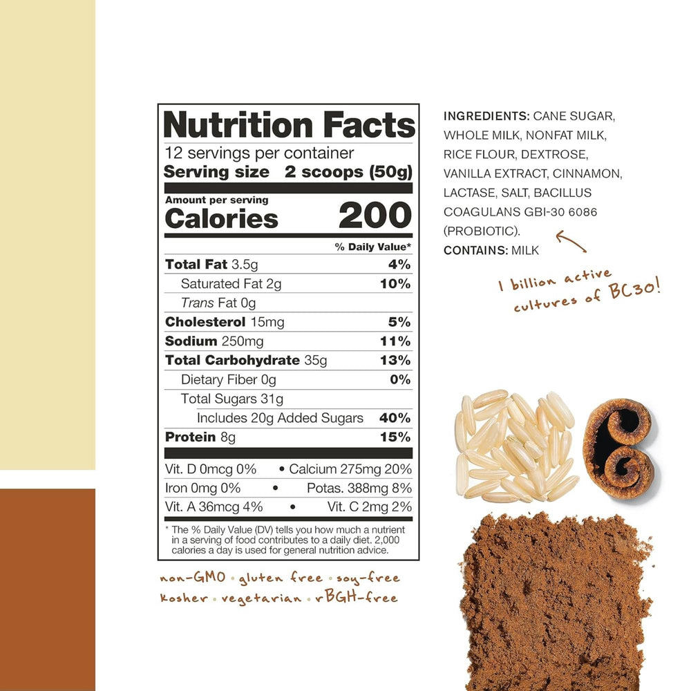 An electrolyte profile that matches what’s lost in sweat for improved hydration. ingredientscane sugar, dextrose, pea protein, medium chain triglycerides (derived from coconut), cocoa powder, rice protein, cocoa extract, gum acacia, salt, vanilla extract, Bacillus coagulans GBI-30 6086 (probiotic) non-GMO, kosher, vegan, gluten free, soy free, rBGH-free+Probiotic BC30: 1 billion active cultures per serving. BC30 supports an overall healthy digestive system, healthy immune system, and enhances protein utilization. Not all probiotic strains are the same - BC30 delivers live cells 10 times more effectively than common probiotic yogurts.