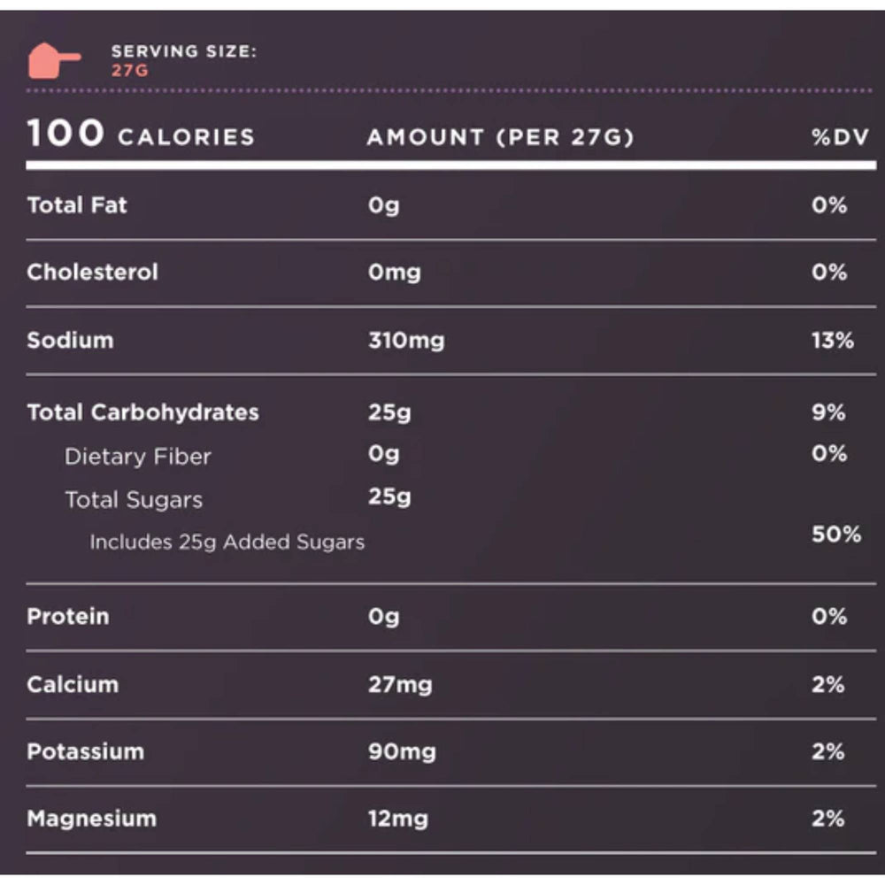 Non-GMO Dextrose (Glucose), Non-GMO Cane Sugar, Citric Acid, Sodium Citrate, Sea Salt, Potassium Chloride, Flavor (Organic Mandarin Orange, Organic Lemon, Organic Berry, Natural Watermelon and Lime, Organic Tropical Fruit, Organic Raspberry, Cola), Calcium Carbonate, Organic Caffeine*, Magnesium Oxide. *Only caffeinated flavors contain organic caffeine. Non-GMO, gluten free, vegan, dairy and soy free.