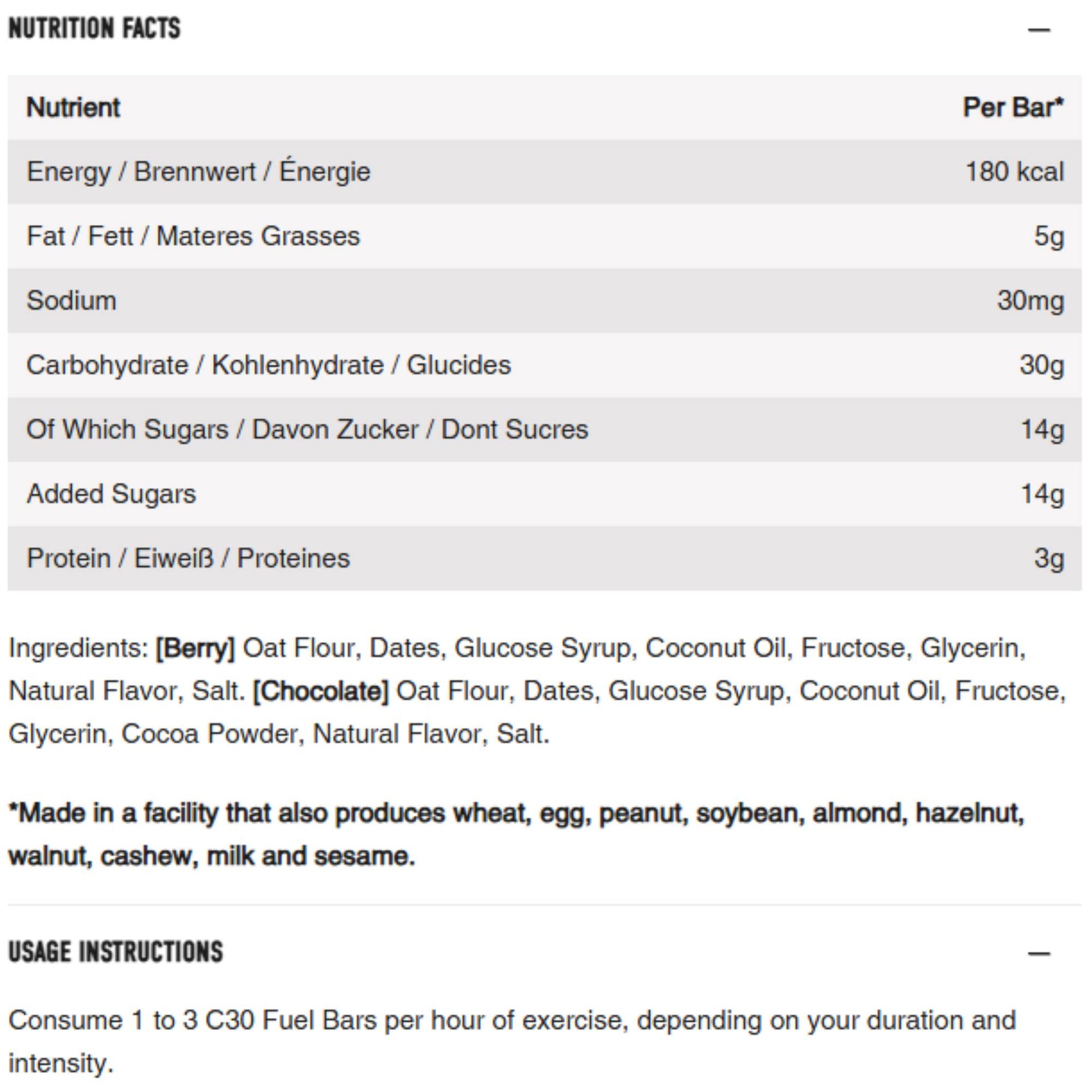 The C30 Fuel Bar delivers 30 grams of fast-absorbing carbohydrates through the well-supported 2:1 glucose-to-fructose ratio. It’s seriously smooth, easy to chew + swallow, and is redefining the performance bar.