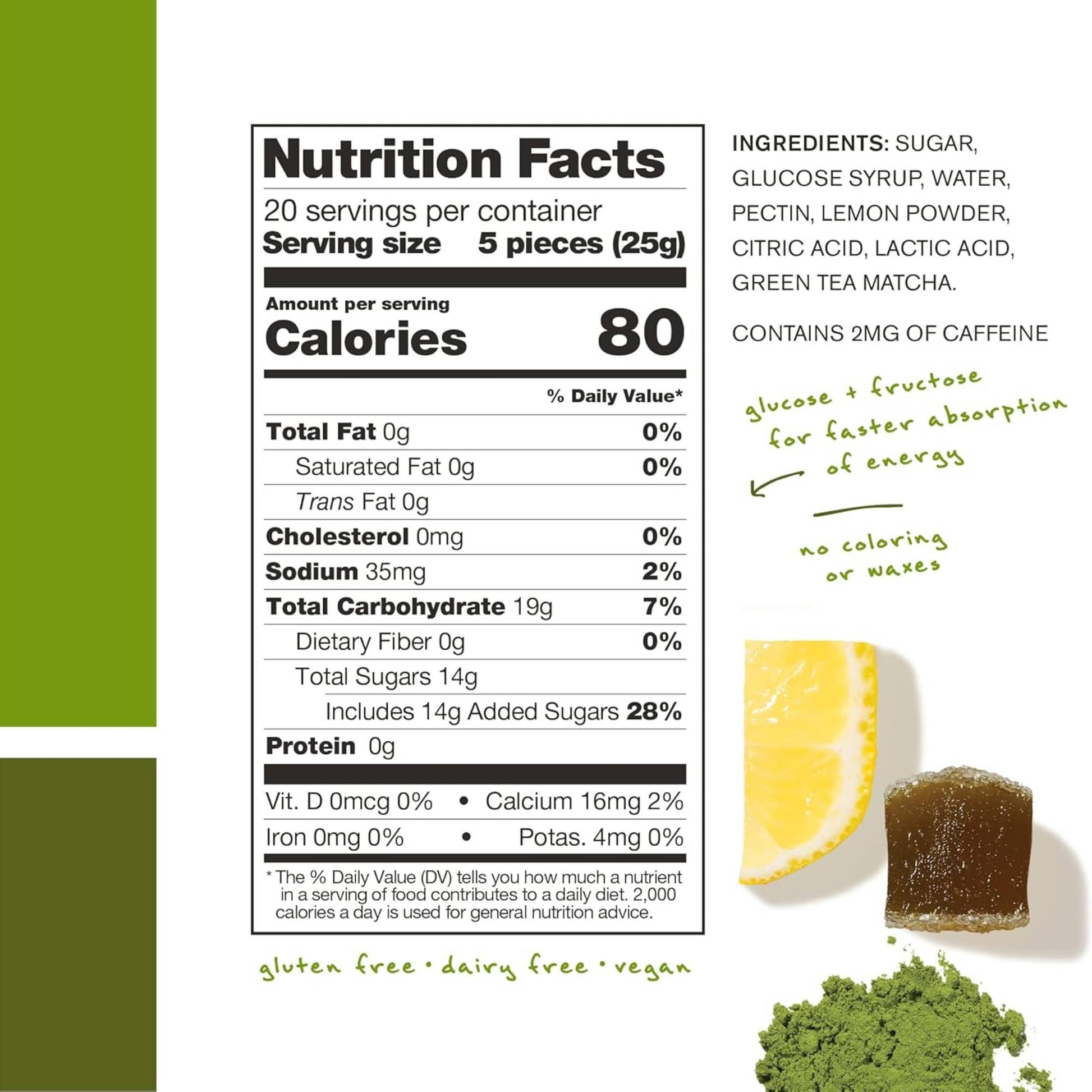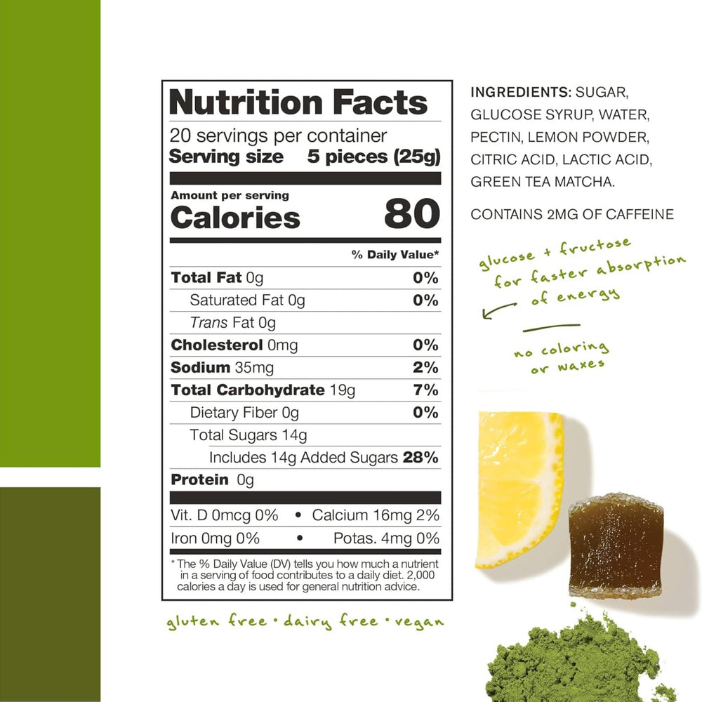 : Sugar, Glucose Syrup, Water, Pectin, Lemon Powder, Citric Acid, Lactic Acid, Green Tea Matcha. The Matcha + Lemon flavor has 4mg of caffeine per pack from the natural caffeine in green tea.