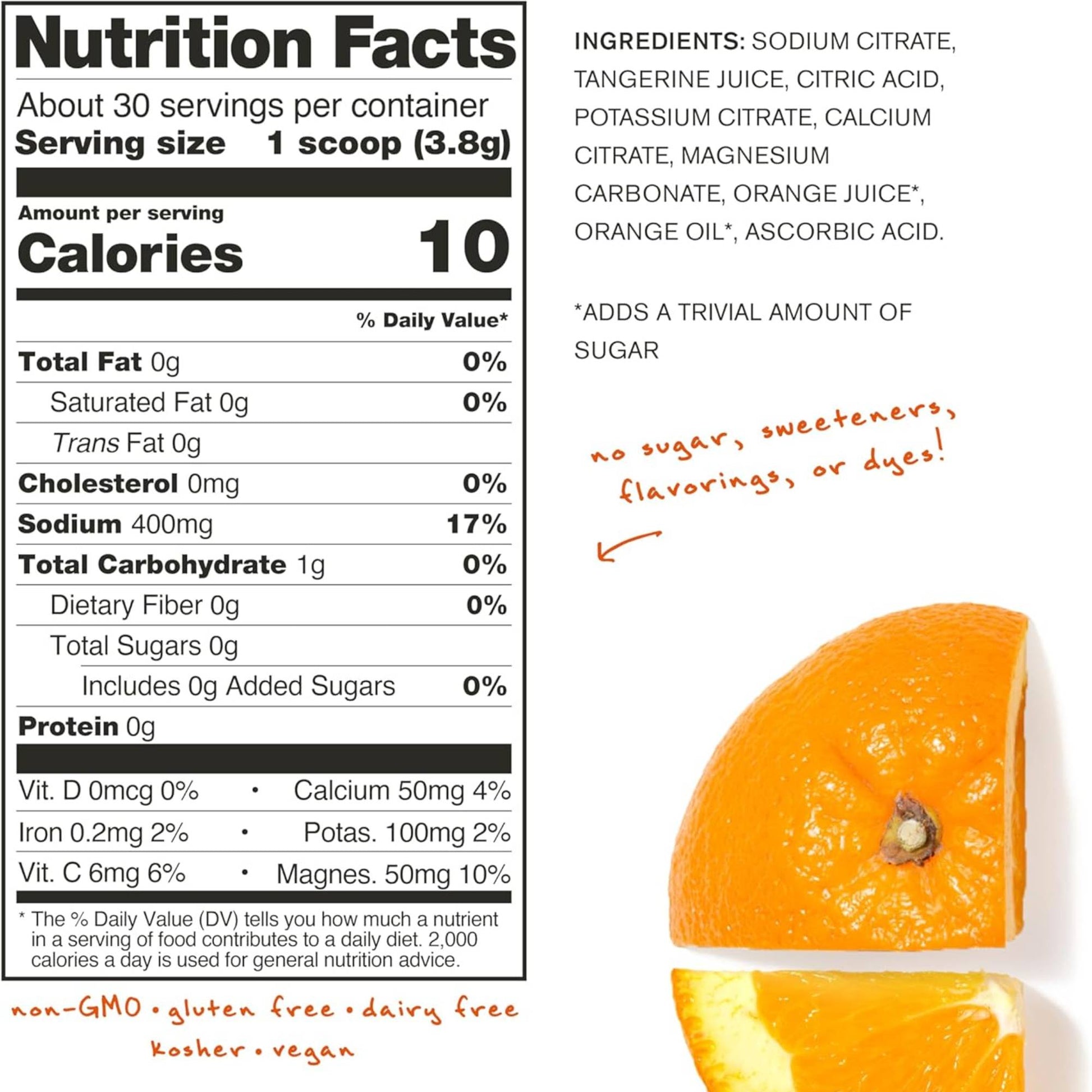 Can be used to help athletes avoid starting workouts at a hydration deficit. ingredientsSodium Citrate, Tangerine Juice, Citric Acid, Potassium Citrate, Calcium Citrate, Magnesium Carbonate, Orange Oil*, Orange Juice*, Ascorbic Acid. *ADDS A TRIVIAL AMOUNT OF SUGAR Dairy-free, Gluten-free, Nut-free, Kosher, Vegan, Non-GMO