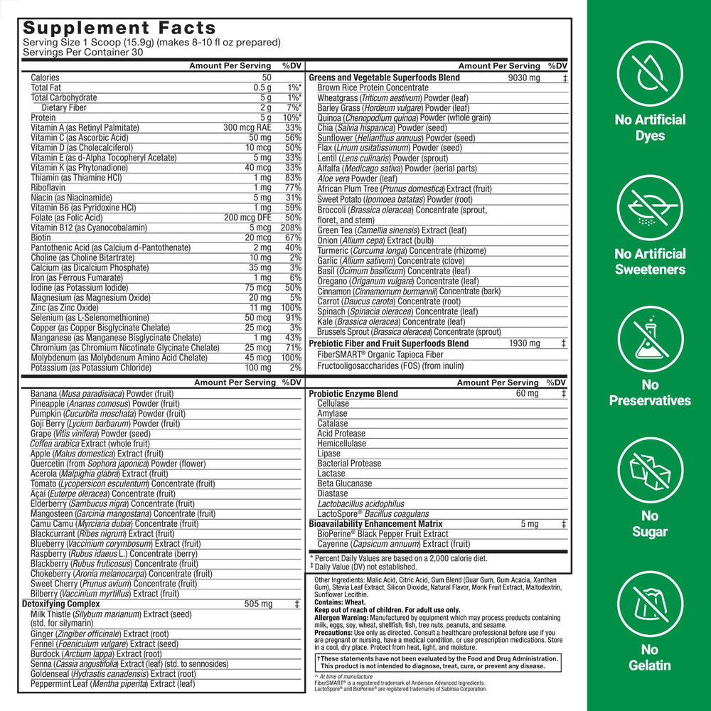 Every refreshing sip provides essential vitamins, minerals, and fiber from more than 40 fruits, vegetables, and superfoods like kale, broccoli, spinach, chia seeds, wheatgrass, exotic berries, turmeric, and more.Detoxifying Complex